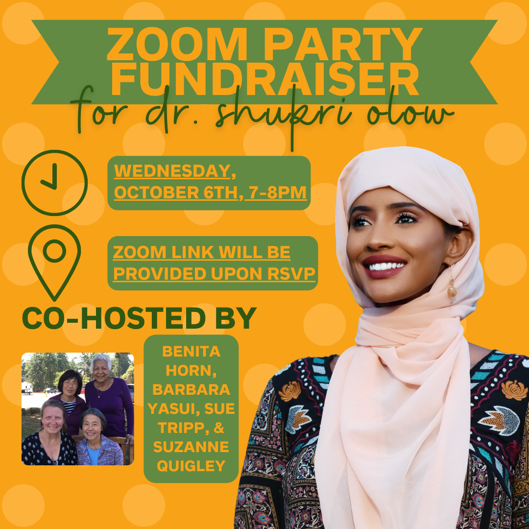 You are invited to an event with Dr. Shukri Olow, who is running for King County Council District 5. Shukri is a mother, community organizer, and someone who works in direct service to families in South King County. She’s also a Somali immigrant who grew up in Kent!
