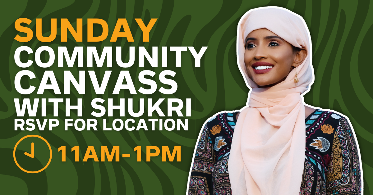 Join us Sunday, October 10th from 11am to 1pm in South King County as we talk directly with voters about electing Shukri as their next King County Councilmember. RSVP on this page for the canvass kick-off location.